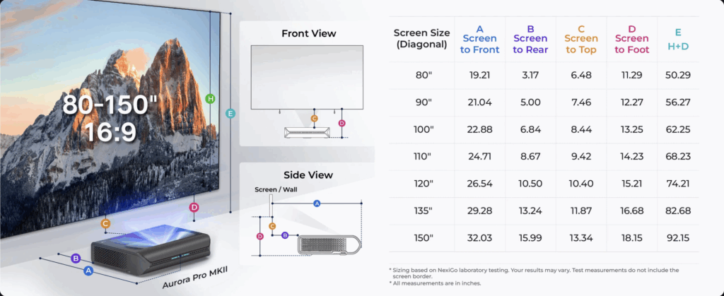 The NexiGo 100″ diagonal Cinematic Fresnel wall-mount fixed-frame ultra short throw screen rejects up to 85% of ambient light from the ceiling overhead and both sides with higher 1.5 gain and a 150° viewing angle (optimal viewing within 50° half-gain angle). 0.4″ frame bezel. Screen must be assembled and mounted on the wall. [build tutorial video] You can purchase your NexiGo Aurora Pro MKII UST projector bundled together with this 100″ screen [buy at Amazon] [with 3D glasses]